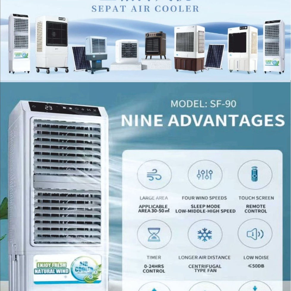 Адиабатният охладител SEPAT SF-90 е високоефективна система за охлаждане, предназначена за складове, автосервизи, производствени помещения, ресторанти, работилници и полуотворени пространства.